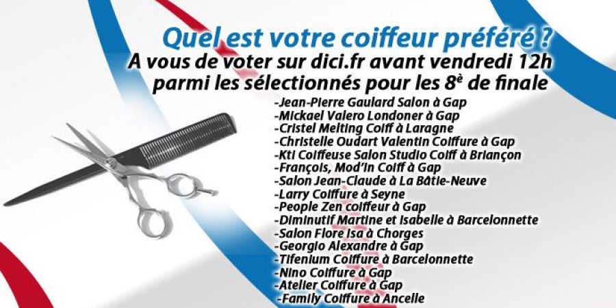 Ça y est, les 16 coiffeurs, en tête du sondage, ont été sélectionnés parmi vos propositions. Continuez à voter sur dici.fr ! Pour ces 16 coiffeurs, débutent les 8èmes de finales. La liste complète est à retrouver sur dici.fr. Les 8 meilleurs seront qualifiés pour les quart de finale. Et un trio de tête se dégage d'ores et déjà. Tifenium Coiffure à Barcelonnette, Kti Coiffure Salon Studio Coiff à Briançon et Salon Jean-Claude à la Bâtie-Neuve mênent la danse mais les autres concurrents suivent non loin derrière. Alors votez pour que votre coiffeur préféré soit élu « le coiffeur préféré des Alpes-du-Sud » !