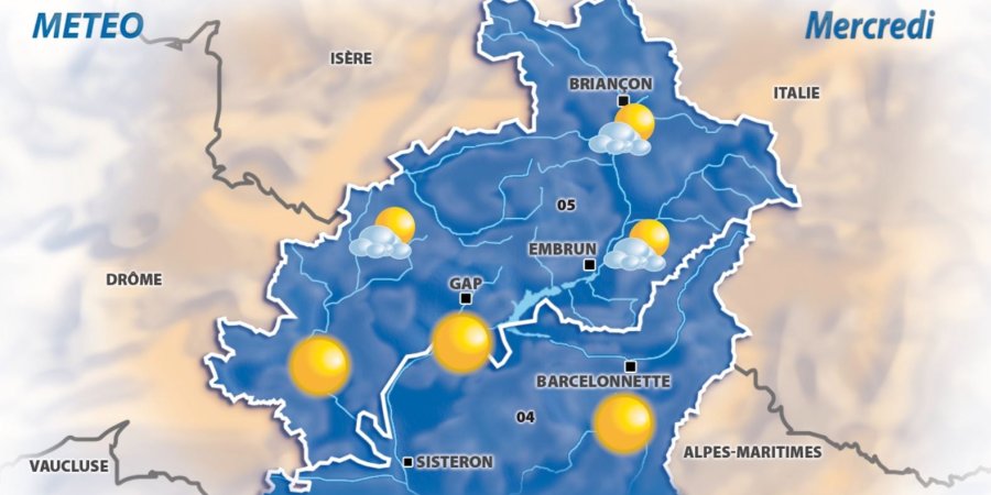 MERCREDI 7 SOLEIL L'amélioration se poursuit. Un temps largement ensoleillé se met en place. Quelques nuages persistent près de la Savoie en début de journée avant de se dissiper en matinée. Les grisailles et nuages bas présents dans le Champsaur et le Valgaudemar sont plus tenaces. Des cumulus se développent l'après-midi sur la chaîne frontalière. Le vent de nord/nord-ouest est assez fort, surtout dans les zones exposées, comme le Buëch ou le Champsaur. Températures un peu fraîches pour la saison avec des maximales de 16/21 degrés en vallées et 11/14 degrés à 2000 m. L'isotherme 0 degré se situe un peu au-dessus de 3000 m.
