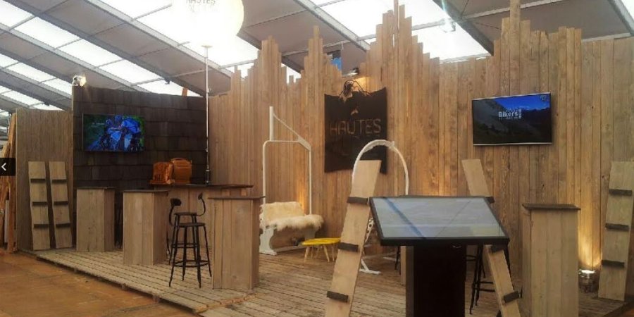 C'est un bel outil de promotion du département qui sera utilisé ultérieurement sur de nombreux salons professionnels et grand public à venir : un espace de 40 m2 mis en œuvre par l’Agence de Développement des Hautes-Alpes. Derniers préparatifs pour le 31e Roc d'Azur 2015 (Fréjus). Ambiance cosy et montagne avec mélèze grisé, mobilier bois et enseigne en métal brossé mais aussi stand interactif avec bornes tactiles, écran géant, ballon lumineux…