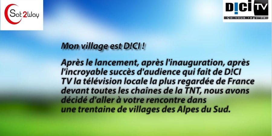 Après le lancement, après l'inauguration, après l'incroyable succès d'audience qui fait de D!CI TV la télévision locale la plus regardée de France devant toutes les chaînes de la TNT, nous avons décidé d'aller à votre rencontre dans une trentaine de villages des Alpes du Sud. A cette occasion, nous allons expliquer aux 30 % de la population qui ne nous captent pas encore comment nous recevoir s'il le faut par satellite grâce à l'offre très accessible de Sat2way partenaire de cette tournée D!CI.