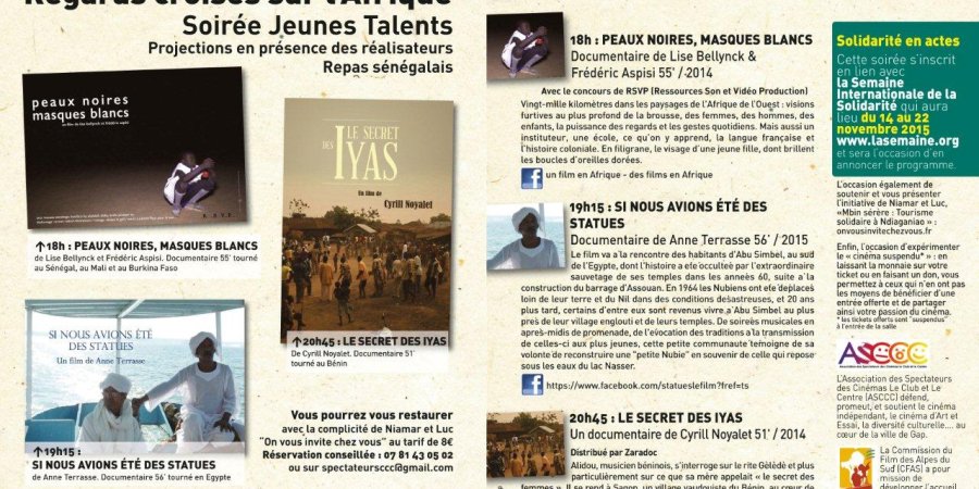 Ce vendredi à partir de 17h30 au Royal à Gap, une soirée jeunes talents est organisée ; Le thème « Regards croisés sur l'Afrique ». Trois documentaires réalisés par de jeunes réalisateurs haut-alpins seront présentés. Fred Aspisi, Lise Ballynck, Cyrill Noyalet et Anne Terrasse seront au Royal pour présenter leurs documentaires et discuter avec les public.
