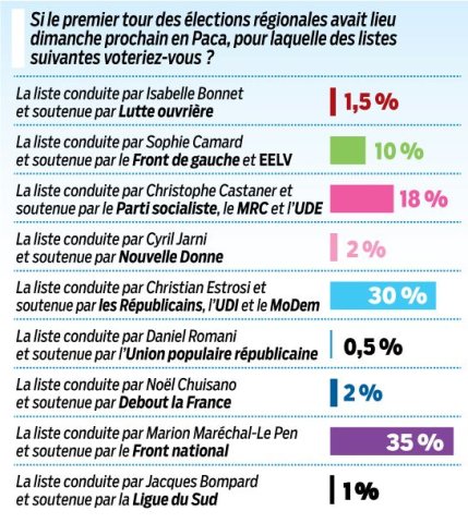 Au 1er tour, Marion Maréchal-Le Pen, qui est créditée de 35 % des intentions de vote, devancerait de cinq points la liste d'union de la droite deChristian Estrosi (30 %). Ce score montre que la députée du Vaucluse n'est pas pénalisée par la guerre politico-familiale qui secoue le FN depuis six mois (Jean-Marie Le Pen a d'ailleurs appelé à la soutenir vendredi). Pour la région, le parti lepéniste avait obtenu 34 % des voix lors des départementales de mars dernier. Mais 35 %, cela représenterait un bond en avant de 15 points par rapport aux résultats du FN lors des régionales de 2010.