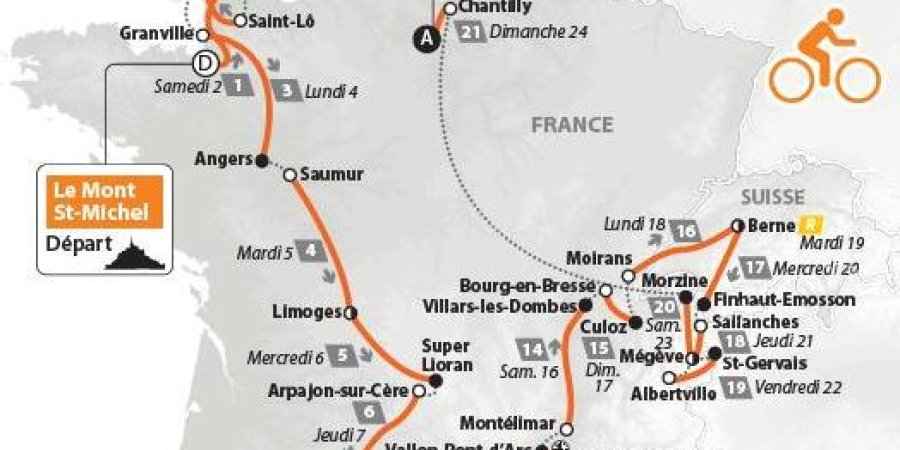 Ce mardi, la carte du Tour de France 2016 sera dévoilée à Paris par Christian Prudhomme. Parmi les informations que nous avons, le Mont St Michel sera le point de départ, un passage par les Pyrénées et l'Andorre, mais pas de passage dans les Alpes du Sud pour ce cru 2016. Mais une arrivée sur le Mont Ventoux sera prévue au 14 juillet.