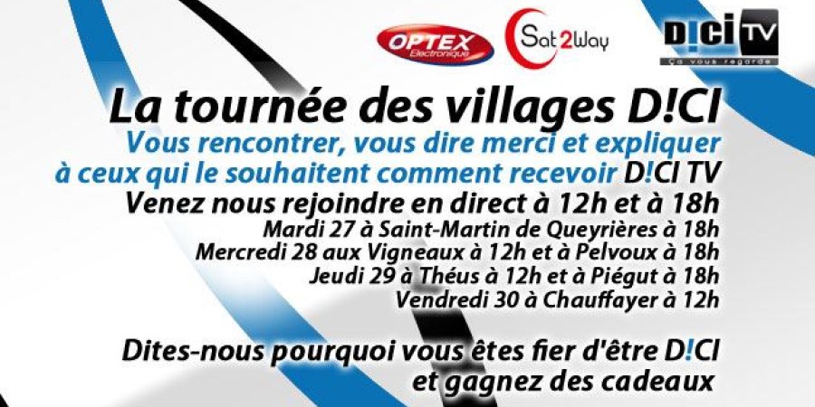Après le lancement, après l'inauguration, après l'incroyable succès d'audience qui fait de D!CI TV la télévision locale la plus regardée de France devant toutes les chaînes de la TNT, nous avons décidé d'aller à votre rencontre dans une trentaine de villages des Alpes du Sud. A cette occasion, nous allons expliquer aux 30 % de la population qui ne nous captent pas encore comment nous recevoir s'il le faut par satellite grâce à l'offre très accessible de Sat2way partenaire de cette tournée D!CI.