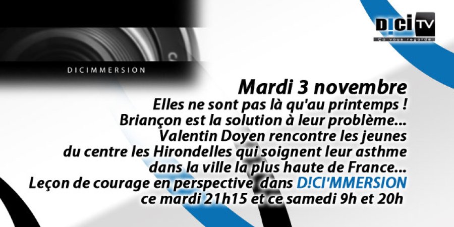D!CI'MMERSION : Elles ne sont pas là qu'au printemps ! Briançon est la solution à leurs problèmes... Valentin Doyen rencontre les jeunes du centre les Hirondelles qui soignent leur asthme dans la ville la plus haute de France... Leçon de courage en perspective dans D!CIMMERSION ce mardi à 21h15 et ce samedi à 9h et 20h.
