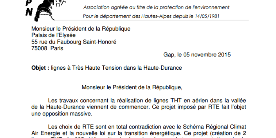 Monsieur le Président de la République,Les travaux concernant la réalisation de lignes THT en aérien dans la vallée