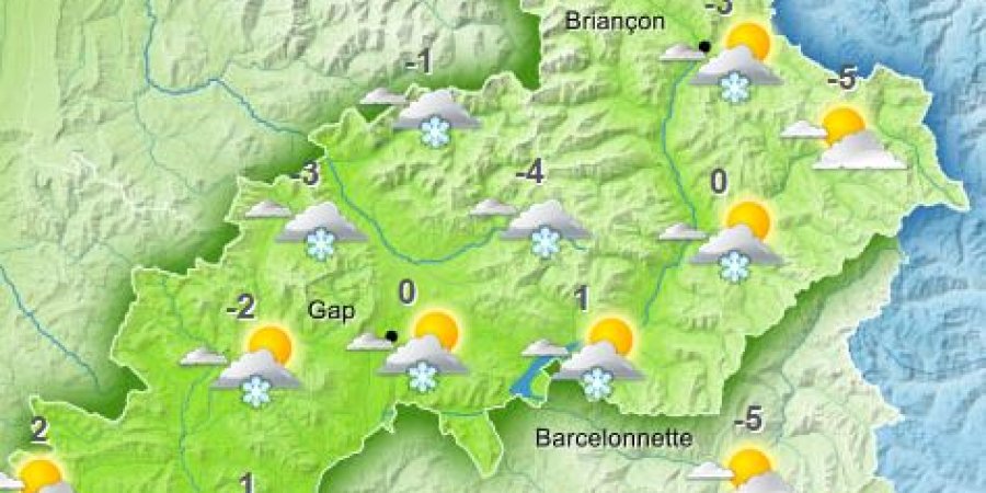 VENDREDI 20 TEMPETE EN MONTAGNE En matinée, de belles éclaircies sont encore présentes dans les basses vallées, mais les nuages envahissent les massifs montagneux. Ces nuages sont plus épais près de la Savoie et de l'Isère où ils donnent déjà des précipitations, sous forme de neige au dessus de 2500 m environ. L'après-midi, les nuages gagnent du terrain mais les précipitations se produisent surtout en montagne, sur le nord et l'ouest des Hautes-Alpes. Le mauvais temps gagne du terrain en cours de nuit suivante mais la neige reste en montagne, au-dessus de 2100 m environ. Les hauteurs de neige attendues au-dessus de 2500 m sont de l'ordre de 20/50 cm en général, mais seulement 5/15 cm sur le Queyras et l'Ubaye. Les températures maximales sont douces avec 13/17 degrés en vallées et 8 degrés vers 2000 m. L'isotherme 0 degré s'affaisse à 3000 m. Le vent de nord-ouest puis ouest atteint encore 50/70 km/h en rafales dans les vallées exposées. De rares rafales peuvent très localement atteindre 100 km/h en fin de journée/nuit suivante dans les hautes vallées. En montagne, le vent de nord reste tempétueux toute la journée avec 80/110 km/h vers 3000 m.