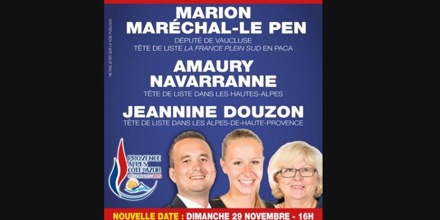 Régionales PACA : Après l'annulation du meeting prévu dimanche dernier à Laragne, en raison des attentats de Paris et de la suspension de la campagne, chaque candidat s'active à nouveau pour repartir en meeting. C'est le cas de Christian Estrosi pour Les Républicains. C'est aussi le cas de Marion Maréchal Le Pen qui finalement sera présente pour un meeting des Alpes du Sud le dimanche 29 novembre à Laragne. *