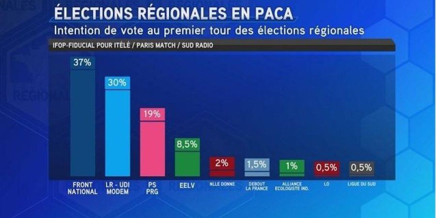 Régionales PACA : Marion Maréchal Le Pen creuse l'écart en tête des intentions de vote pour les prochaines régionales au 1er et au 2d tour. Selon un sondage Ifop-Fiducial pour iTELE, Paris Match et Sud Radio, le Front national reste en tête des intentions de vote au premier (37%) et au second tour (38%). Marion Maréchal-Le Pen distance notamment son principal rival Christian Estrosi. Pour la 1ere fois, une bascule de la région vers le FN devient un scénario sérieusement envisageable.