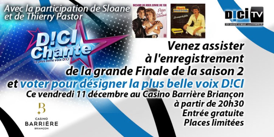 Ils sont en finale ! Quelle est la plus belle voix D!CI ? Retour sur le parcours de nos deux finalistes. D!CI Chante présenté par Irénée Rostan depuis le Casino Barrière de Briançon. Venez assister à l'enregistrement de la grande finale de la saison 2 et voter pour désigner la plus belle voix D!CI. Ce vendredi 11 décembre au Casino Barrière de Briançon à partir de 20h30. Entrée gratuite et places limitées.