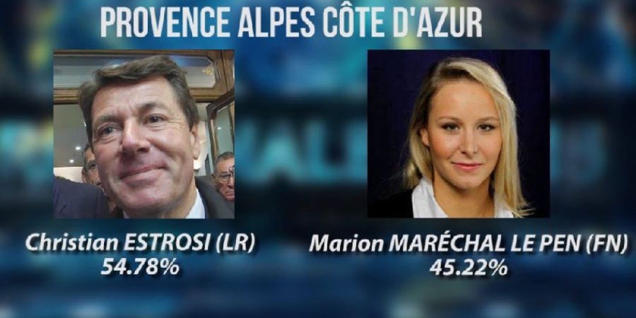 Régionales PACA : La droite, soutenue par la gauche, remporte les élections régionales en Provence-Alpes-Côte d'Azur. La liste emmenée par Christian Estrosi est élue avec 54,78 % des voix face à celle emmenée par Marion Maréchal Le Pen (45,22%). Retour sur les enseignements des élections de ce dimanche:*