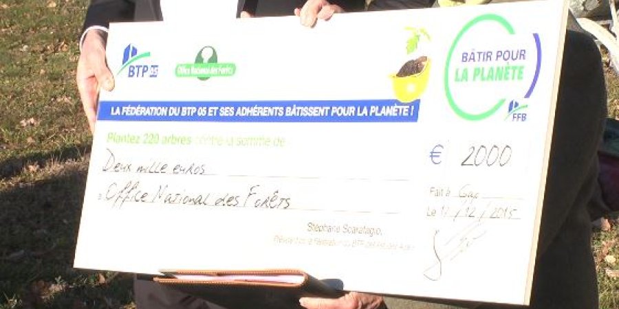 Le BTP 05 a signé un chèque de 2000€ à l'Office National des Forêts dans les Hautes-Alpes ce jeudi à Gap. Dans le cadre de la COP 21, la Fédération Française du Bâtiment avait lancé, il y a plusieurs semaines, l'opération "bâtir pour la planète", un partenariat avec l'ONF pour parrainer des opérations de reboisement en France. Dans les Hautes-Alpes, cela s'est traduit par un don de 2000€ du BTP 05 à l'ONF, qui vont financer la plantation de 200 mélèzes dans le Buëch à l'automne 2016. Stéphane Scarafagio, le président du BTP 05 :