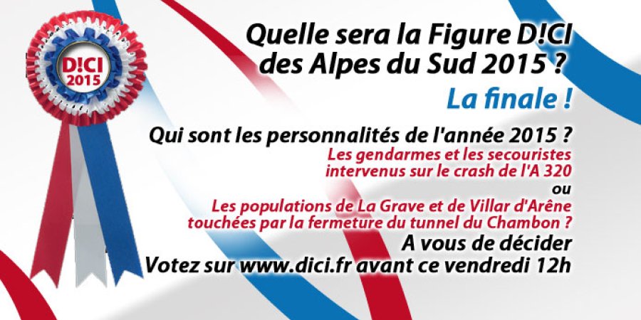 Grande finale du concours des Figures D!CI qui oppose les habitants de la Grave Villar d'Arène confrontés au problèmes du Chambon (38%) et les gendarmes et secouristes pour leur travail sur le Crash de l'A320 (62%). C'est à vous de voter avant vendredi pour élire votre personnalité préférée. Vous votez sur dici.fr*