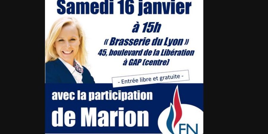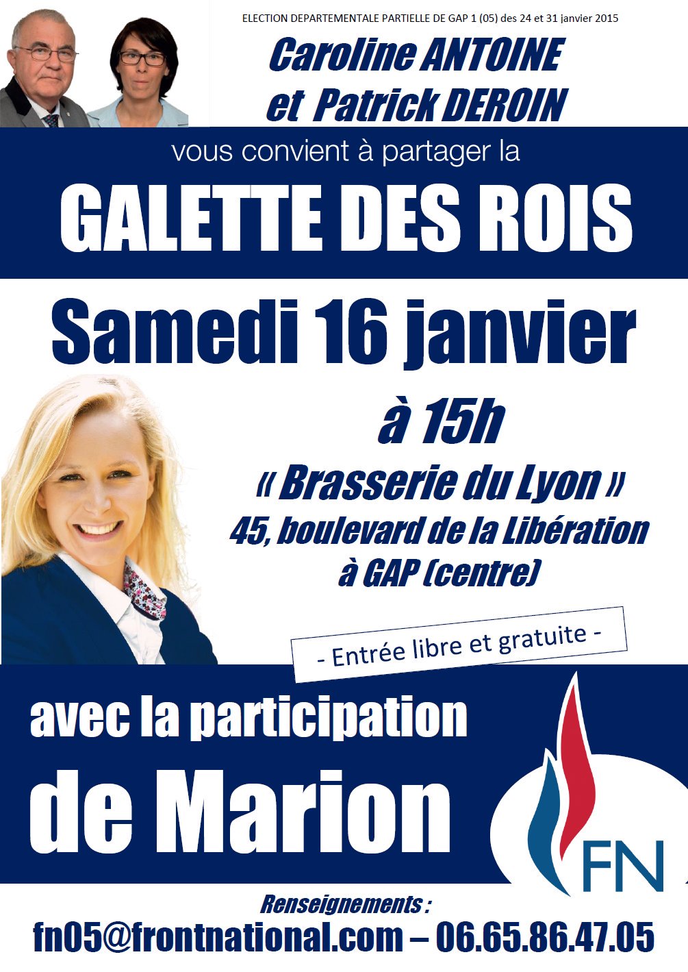 Hautes-Alpes : Comme nous vous l'annoncions dès la semaine dernière, Marion Maréchal Le Pen sera à Gap samedi. La députée FN du Vaucluse, et leader de l'opposition en Région PACA, apportera son soutien au binome candidat sur Gap 1 : Patrick Deroin et Caroline Antoine. Parmi les rendez-vous de cette journée, un moment convivial autour de la galette des rois avec les militants et sympathisants. *