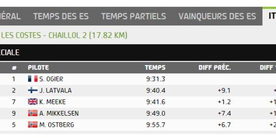 Ce dernier a connu une fin de journée délicate avec la casse de la barre anti-roulis de sa DS3 dans l’ES7 (20s de pénalité pour un pointage en retard) puis une sortie dans un champ dans ce chrono.