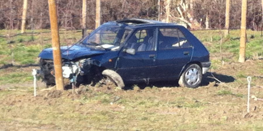 Une voiture s'est encastrée dans un champ de plantations de pommiers après avoir fait une sortie de route. Pendant sa sortie, il a emporté avec lui plusieurs poteaux comme vous pouvez le voir sur ces images.