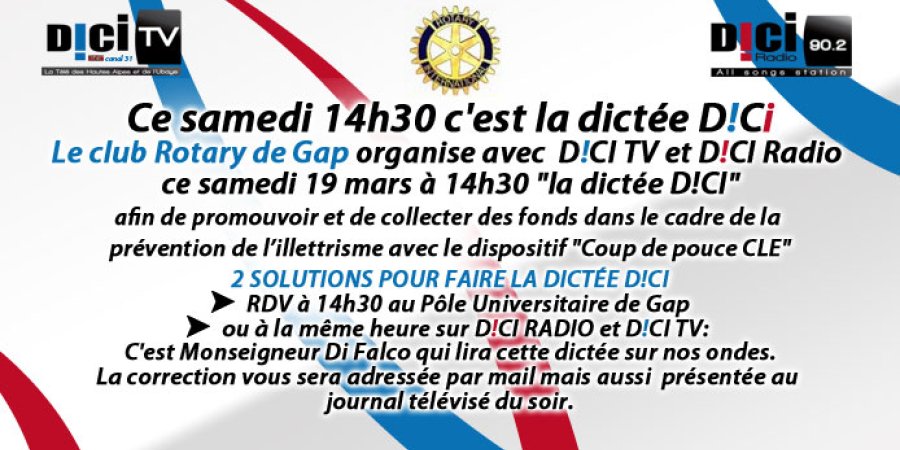 La Dictée D!CI c'est ce samedi! Rendez-vous à 14h30 en direct, sur D!CI TV, D!CI Radio ou au pôle universitaire de Gap. Et c'est Mgr Di Falco, qui lira cette dictée sur nos ondes.