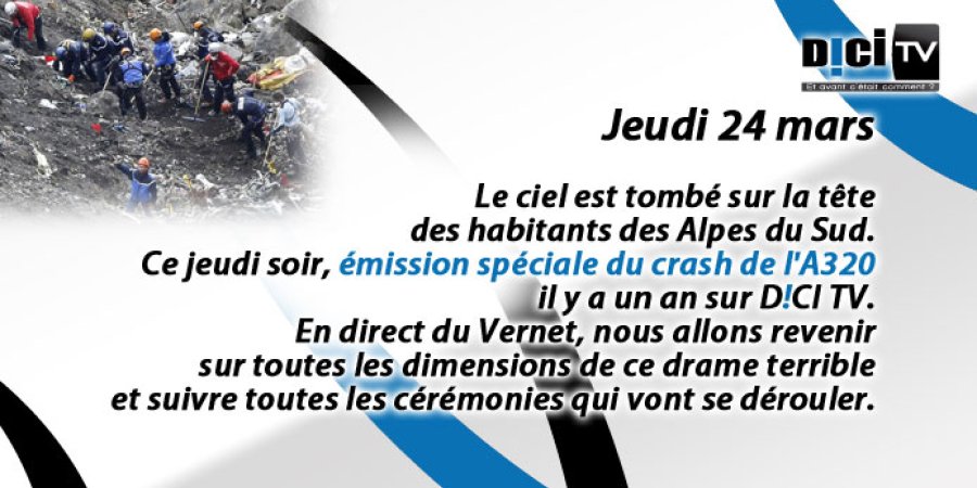 Il y a un an, jour pour jour, à 10h41, 150 personnes ont trouvé la mort dans le crash de l'A320 dans le massif des Trois-Evêchés. D!CI consacre une journée spéciale à la pire catastrophe qu'ait jamais connu les Alpes du Sud. En direct du Vernet, nous allons revenir sur toutes les dimensions de ce drame terrible et suivre toutes les cérémonies qui vont se dérouler avec une interruption d'antenne de 10h41 à 11h00.
