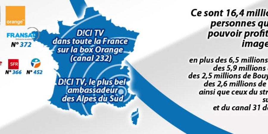 Après la Région PACA depuis 1 an et demi, D!CI TV est désormais disponible auprès des quelques 17 millions d'abonnés Live Box en France et c'est sur le canal 232 ( et la mosaïque du canal 30 d'ici quelques jours) que depuis Paris , Rouen , Montpellier ou encore Strasbourg...et partout en France, tous les abonnés à la TV d' Orange peuvent désormais profiter de nos programmes.