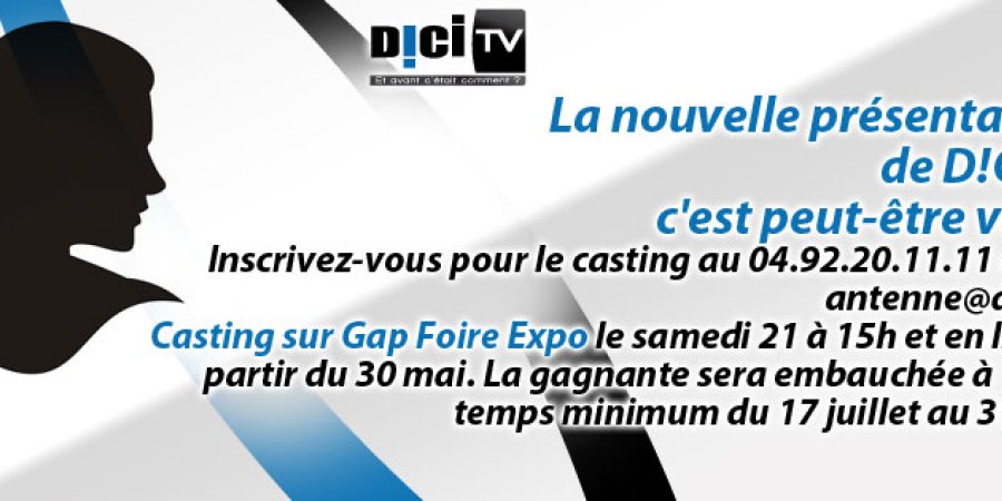 La nouvelle présentatrice de D!CI TV c'est peut être vous ! Inscrivez vous dès maintenant pour le casting au 04 92 20 17 17 ou sur antenne@dici.tv. Le casting se déroulera le samedi 21 à 15 heures et en ligne à partir du 30 mai. La gagnante sera embauchée à mi temps minimum du 17 juillet au 31 août.