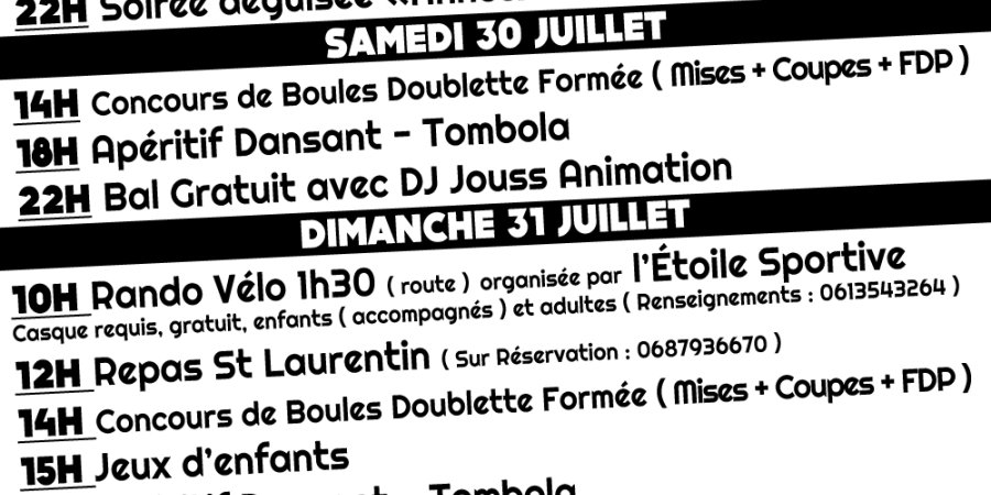 Publié par Anonyme (non vérifié) le jeu, 28/07/2016 - 09:22 Saint Laurent du Cros est en fête ce week-end, avec au programme concours de boules, bal, et feux d'artifice :