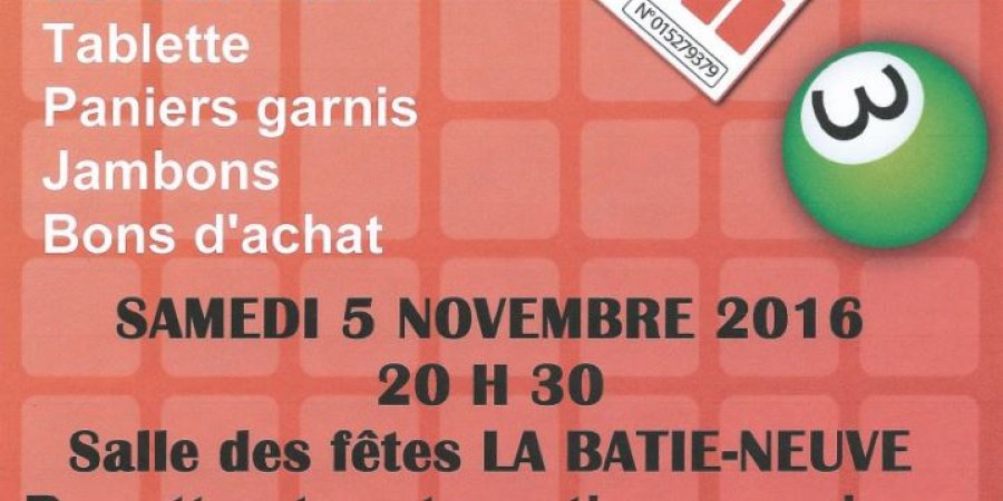 Un gros loto est organisé samedi 5 novembre à 20h30 à la salle des fêtes de la Bâtie-Neuve. De nombreux lots sont à gagner, tels qu'une télévision, un écran plat, une tablette, des paniers garnis ou encore des jambons... Une buvette et restauration seront disponibles sur place.