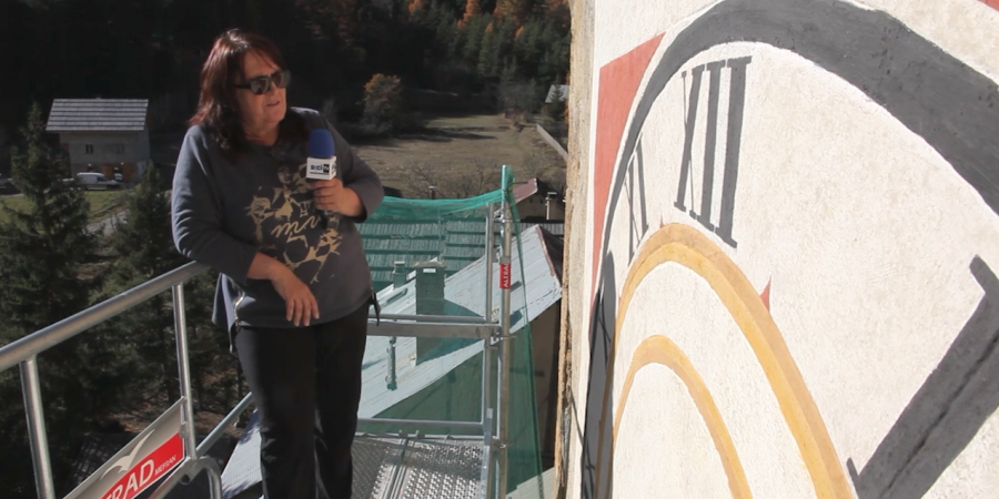Evelyne Rey-Peyrot, cadranière et restauratrice de peintures murales à Névache, vient d'achever la restauration du cadran de l'horloge de l'église Saint-Claude de Val-des-Prés.
