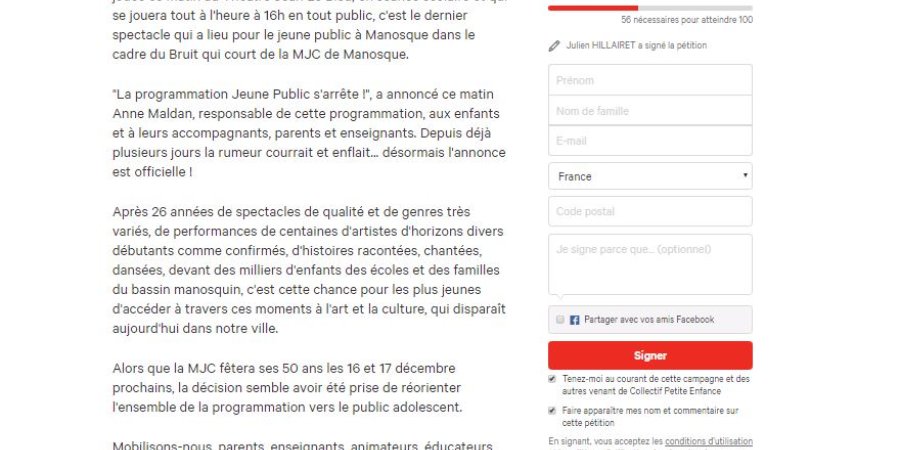La programmation « Jeune Public » s'arrête à la MJC de Manosque qui fête ses 50 ans cette année. Depuis 1996, la maison de jeunes et de la culture programmait des nombreuses représentations destinées aux plus jeunes. Décision a été prise par la direction de réorienter l'ensemble de la programmation vers le public adolescent. Alors une pétition est en ligne pour que cette programmation jeune public continue et certains parents, enseignants, animateurs, éducateurs et artistes se mobilisent pour sauver cette programmation. On écoute Anne Maldau, la responsable culturelle « jeune public » à la MJC de Manosque :