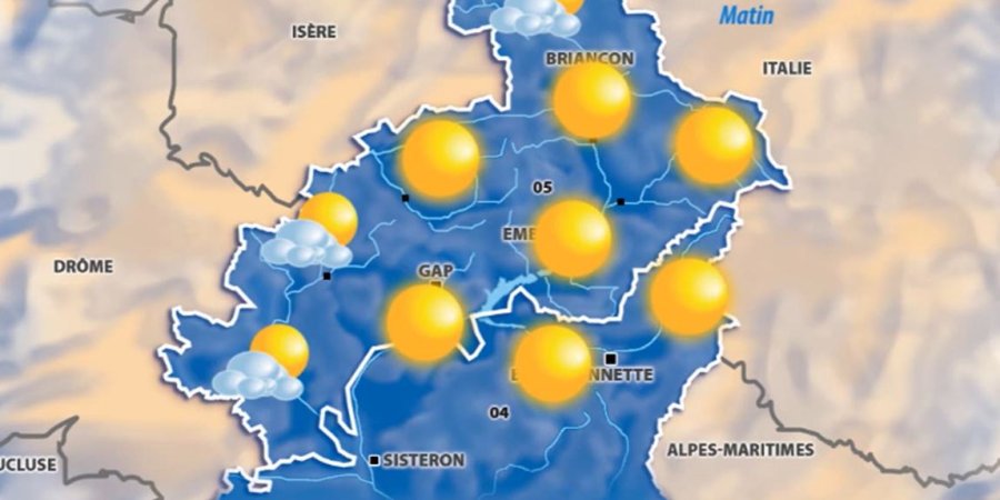 Les hautes pressions maintiennent toujours un temps sec et très largement ensoleillé pour cette journée, quelques passages nuageux d'altitude sont observables mais restent très peu épais. Les températures maximales, bien qu'en légère baisse, sont encore de 10 à 14 degrés en vallées et 6/8 degrés à 2000 m. L'isotherme 0 degré se situe vers 2900 m. Vent de Nord-est à Est à 30/40 km/h qui varie au cours de la journée mais reste modéré. A 3000 m, le vent est de Nord- est à est à 40/60 km/h.