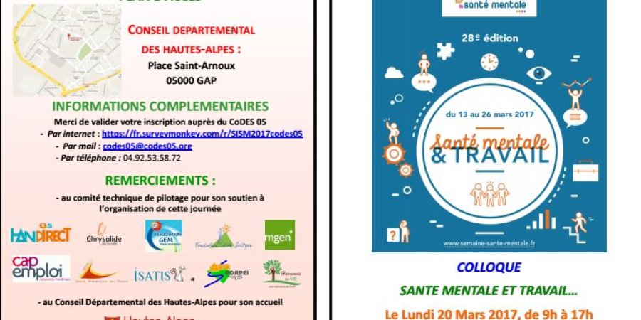 « SANTE MENTALE ET TRAVAIL » C'est le thème de la 28ème Semaine d’Information sur la Santé Mentale...Le département se mobilisera le lundi 20 mars avec le comité départemental d'éducation pour la santé des Hautes-Alpes (CODES 05). Rendez-vous est fixé pour un grand colloque de 9h à 17h au Conseil Départemental des Hautes-Alpes, Place Saint-Arnoux, à Gap.