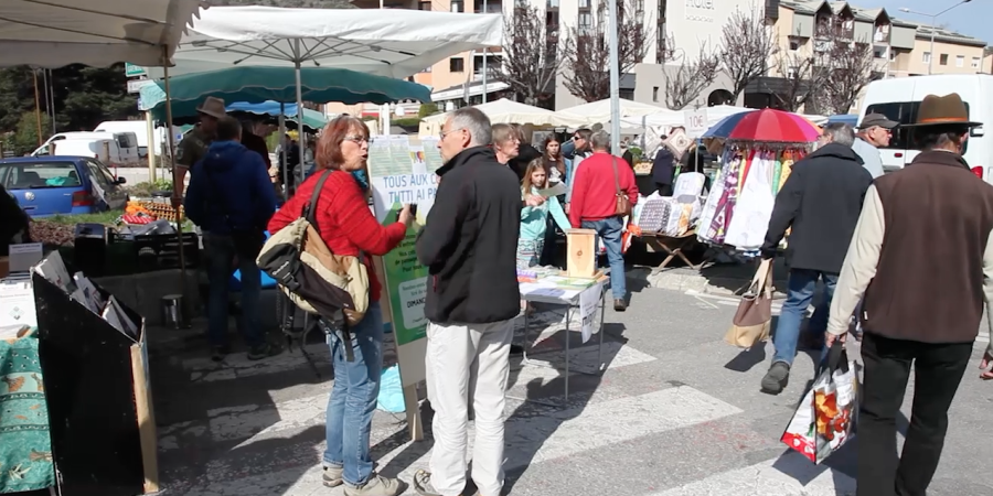 Ambiance printanière sur le marché de Briançon bien loin de la préoccupation de l’élection présidentielle qui n’est pourtant plus qu’à 10 jours. La campagne est loin d’occuper les conversations et même du côté des militants, c’est très calme avec seulement un distributeur de tracts pour Benoît Hamon et un stand d’une association d’aide aux migrants.