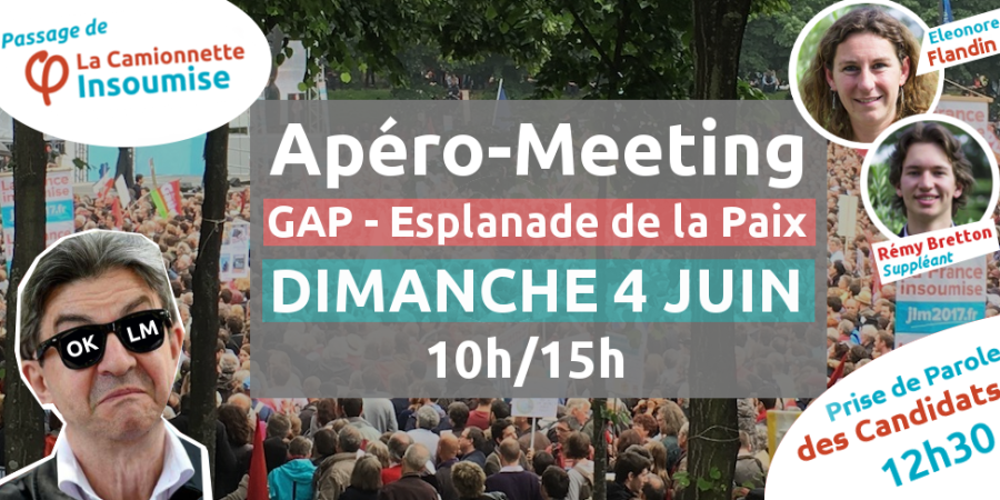 Dans le cadre des élections législatives, les candidat.e.s de la France Insoumise de la première circonscription des Hautes-Alpes tiendront avec les insoumis un apéro-meeting, à l'occasion du passage de la Camionnette Insoumise à Gap ! Il aura lieu ce dimanche à partir de 10 heures esplanade de la Paix.
