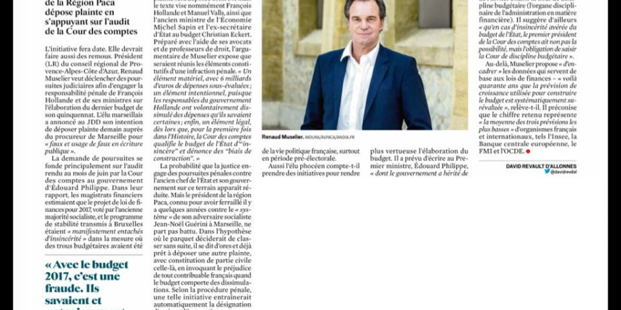 C'est du jamais vu et cela va devrait susciter beaucoup de remous : le Président de la Région Provence-Alpes-Côte d’Azur, Renaud Muselier, annonce dans le Journal du Dimanche qu'il va déposer une plainte contre X pour faux et usage de faux contre le dernier budget de François Hollande.