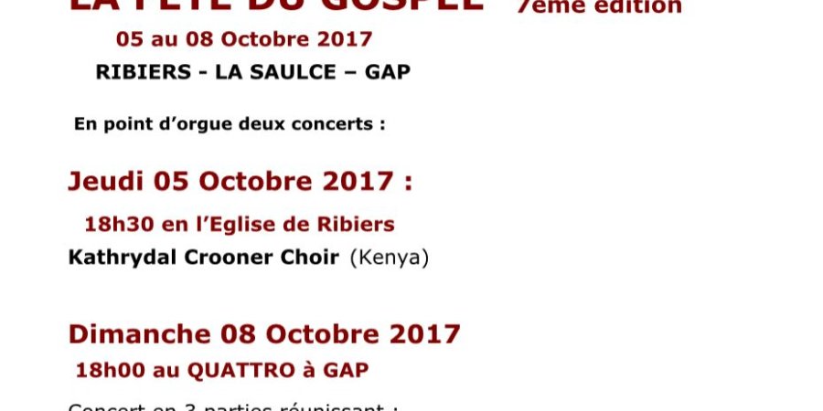 Elle débute ce jeudi. La 7e édition de la fête du Gospel se déroule à Ribiers, La Saulce et Gap. Au programme : un chef de coeur californien, un pianiste catalan, un groupe kényan mais également un groupe catalan avec Pourpre Noire et pas moins de 150 choristes.