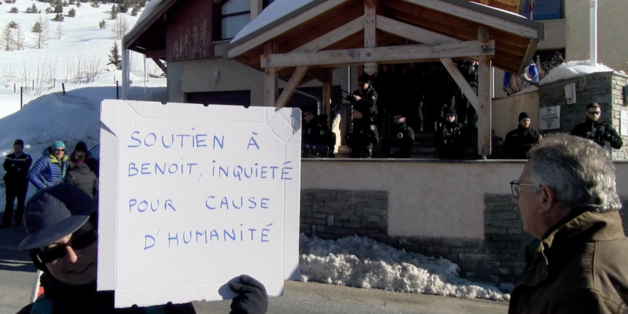 Plus d'une centaine de personnes se sont retrouvées à Montgenèvre, devant le poste de la Police Aux Frontières pour soutenir Benoît Ducos qui était entendu en audition libre après avoir secouru une migrante nigériane sur le point d’accoucher. L’audition a duré un peu plus d’une heure, dans de bonnes conditions selon Maître Djermoune. À la sortie du poste de police, Benoît Ducos était très ému. Il a remercié ses soutiens et, surtout, rappelé le sens de son engagement.