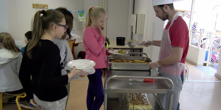 Après la conférence de Gilles Daveau "Manger moins (et mieux) de la viande", l’heure était aux travaux pratiques pour l’équipe de cuisine du Centre Lepoire, la cantine scolaire de Briançon. Le menu était en effet entièrement composé de plats alternatifs. Et pour motiver les enfants à goûter et agrandir leur palette gustative, les repas étaient précédés de lecture de contes tels que "La princesse aux petits pois" ou "La tartichouflette de Jack".