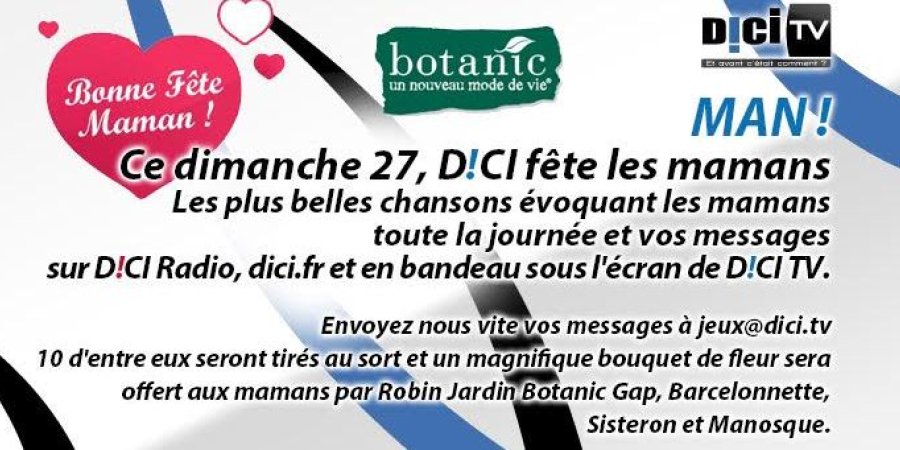 Envoyez-nous vite vos messages à jeux@dici.tv. 10 d'entre eux seront tirés au sort et un magnifique bouquet de fleurs sera offert aux mamans par Robin Jardin Botanic Gap, Barcelonnette, Sisteron et Manosque.