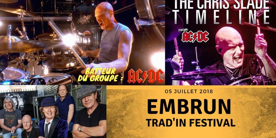 Il sera au plan d'eau d'Embrun le 5 juillet prochain ! Chris Slide, le batteur du groupe AC/DC sera en concert à l'occasion de la 9e édition du Trad'in Festival. Accompagné de ses musiciens du groupe "Timeline", il reprendra de nombreux titres du mythique groupe. Un show exceptionnel donc pour l'ouverture des festivités. Notez également le 6 juillet, la venue des Ogres de Barback et le 7 juillet, celle de Massilia Sound System.
