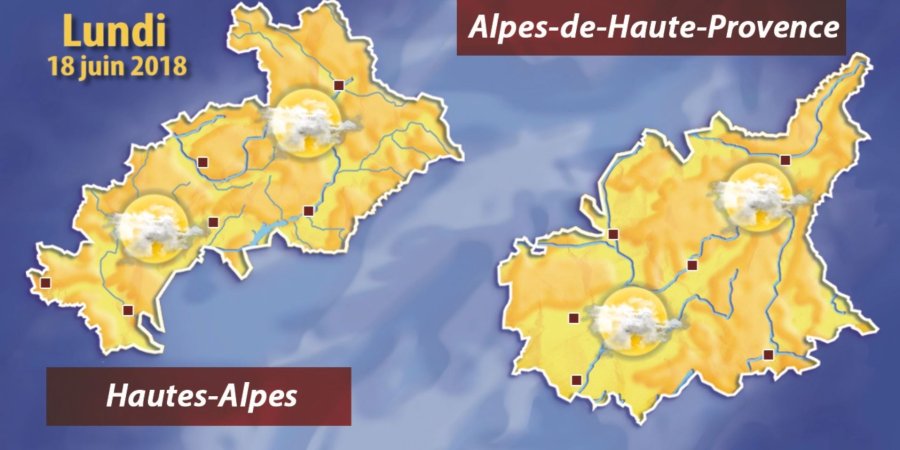 Lundi, à part quelques grisailles locales qui se dissipent et des passages nuageux près de l'Italie, le soleil matinal est généreux. L'après-midi, l'ensoleillement n'est contrarié que par de fins voiles nuageux et des cumulus. Pas ou très peu d'averses prévues. Les températures maximales sont généralement comprises entre 24 et 28 degrés en vallées, 15 à 19 degrés à 2000 m. Sortez crème solaire et maillot de bain, le reste de la semaine promet d'être estival ! Les habitants de Forcalquier, eux, sont impatients !