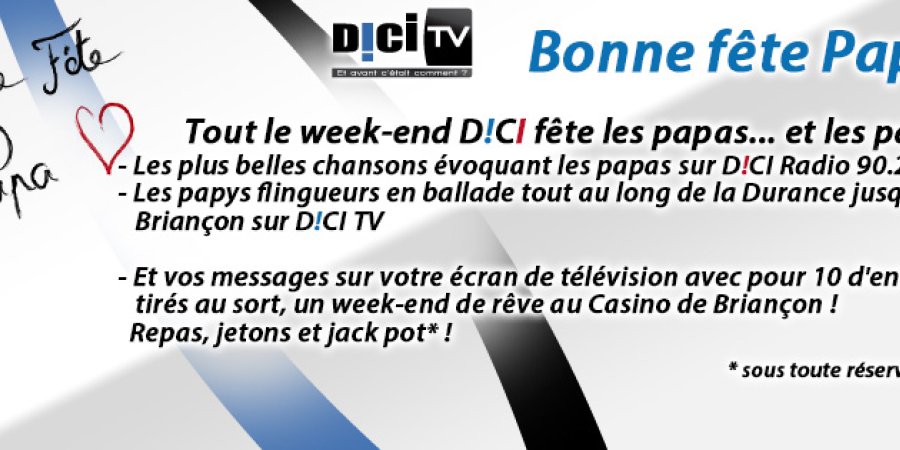 Vous avez été nombreux à nous avoir envoyé des messages pour la fête des pères ! Comme prévu, nous en avons tiré 10 au sort et chacun des papas concernés se verra offrir un une soirée de rêve au casino Circus de Briançon. Contactez vite le 04.92.52.07.31 (choix n°2) en nous laissant votre numéro.