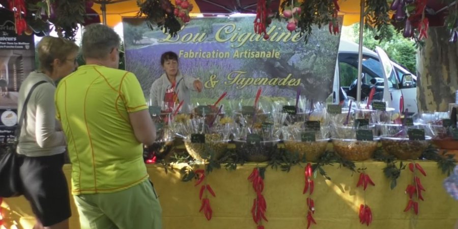 Bien qu’il y ait moins de fréquentation cette année, comme dans tous les secteurs marchands de la région, Marie, vendeuse au marché de Chorges, prend le temps de faire goûter ses produits aux touristes de passage. Nous la retrouvons en pleins conseils sur les olives et autres tapenades !