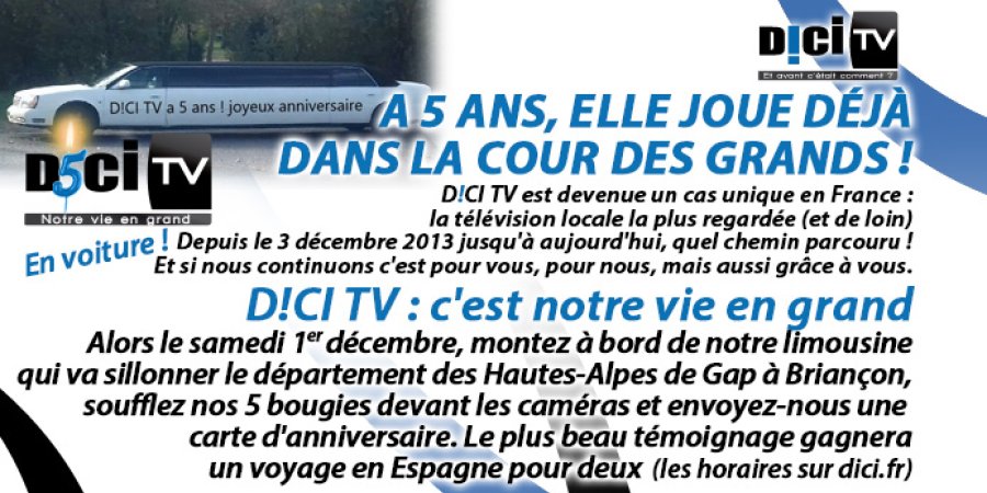 Alors, le samedi 1er décembre, montez à bord de notre limousine qui va sillonner le département des Hautes-Alpes de Gap à Briançon, soufflez nos 5 bougies devant les caméras et envoyez-nous une carte d’anniversaire. Le plus beau témoignage gagnera un voyage en Espagne pour deux.