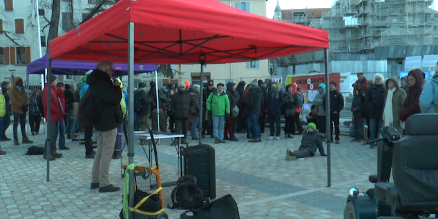 Après la mobilisation de ce mercredi qui a rassemblé entre 80 et 100 personnes à Montgenèvre, les soutiens des deux maraudeurs haut-alpins qui comparaissent ce jeudi devant le tribunal correctionnel de Gap pour "aide à l’entrée irrégulière d’un étranger en France" se sont donné rendez-vous sur la place Saint-Arnoux, devant le conseil départemental, à Gap. 150 personnes y sont rassemblées en soutien aux prévenus, sous l'oeil des gendarmes qui ont mis en place un important dispositif.