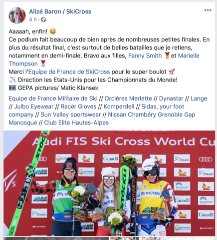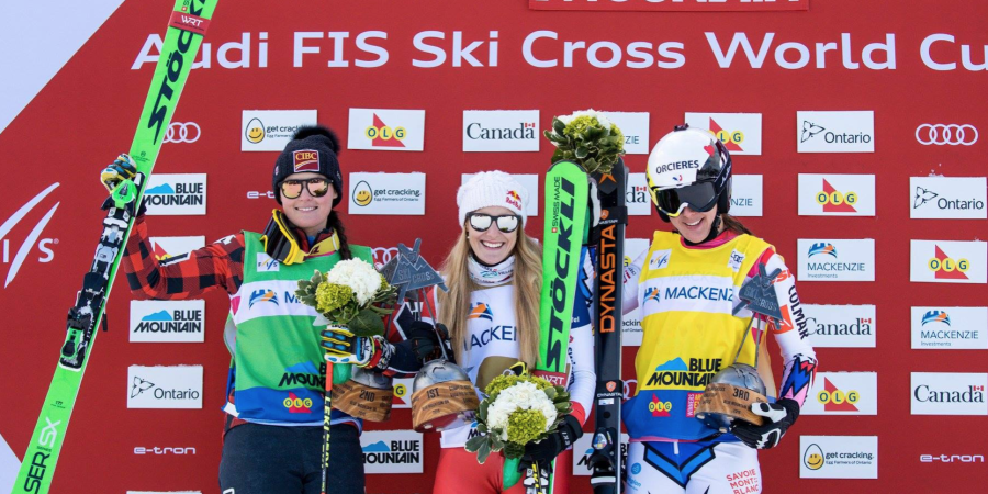 Alizée Baron sur le podium à Blue Mountain ! La championne d'Orcières de ski-cross continue de monter en puissance. C'est son premier podium sur le circuit depuis un an. Elle termine troisième derrière Fanny Smith (1ère) et la Canadienne Marielle Thompson (2e).