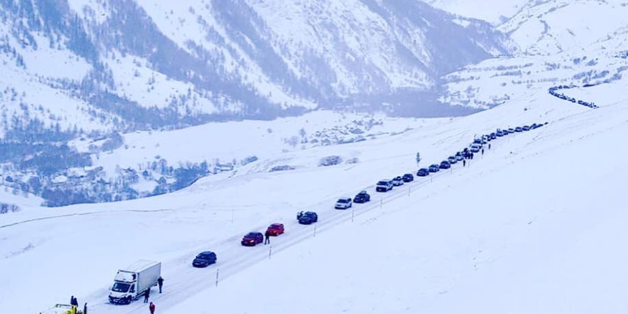 Suite aux déclenchements réussis d'avalanche, des kilomètres de bouchons se sont formés en attendant que que le chasse-neige que l'on voit puisse dégager la chaussée.