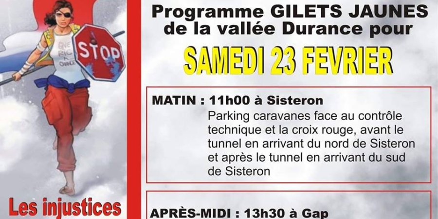 "Mêmes revendications, même combat ! " Les gilets jaunes et l'intersyndicale continueront de manifester ce samedi dans les rues de Gap. Ils seront présents dès 14 heures sur l'esplanade du Conseil Départemental pour revendiquer le droit de travailler et de vivre dignement, le rétablissement de l'impôt sur la fortune, l'augmentation du pouvoir d'achat, des salaires, des pensions et des minima sociaux, le développement des services publics et la consultation démocratique et régulière des citoyens.