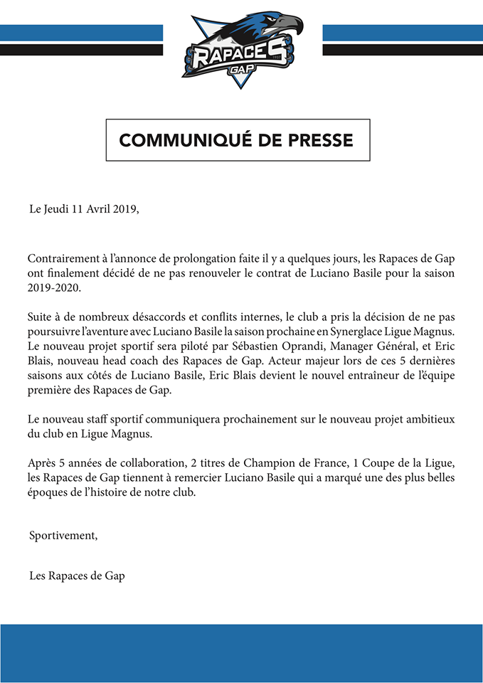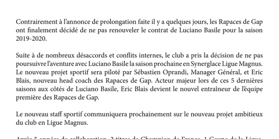 Malgré le climat qui paraît conflictuel, le club remercie Luciano Basile qui a conduit les Rapaces à deux titres de Champion de France et une coupe de la Ligue, " une des plus belles époques du club".