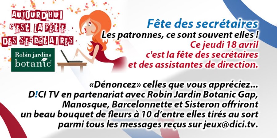 Bonne fête à toutes les secrétaires et assistantes de direction ! Certaines d'entre elles ont eu une bonne surprise ce jeudi au téléphone. Celles qui nous ont été signalées et qui ont été tirées au sort ont remporté un bouquet de fleurs de chez Botanic Gap, Manosque et Barcelonnette.