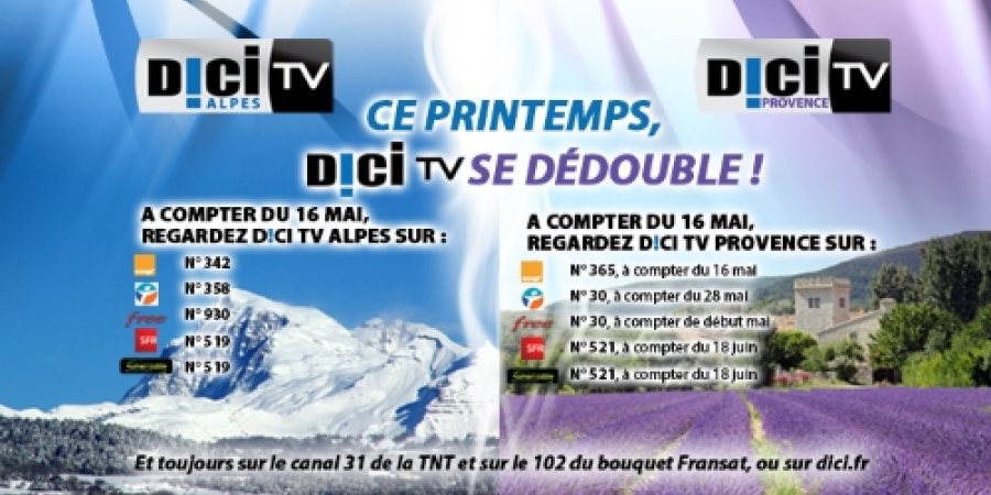 Bonne nouvelle donc pour les habitants du 04 qui nous captent par les box mais aussi pour ceux du 05 qui jusqu'ici captaient le programme Provence sur leurs box... mais rien n'empêche les uns et les autres de nous regarder sur les 2 canaux ! Quand on aime, on ne compte pas ! et deux fois plus de chance, partout en France de voir des images de nos si belles Alpes du Sud.