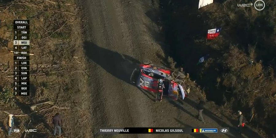 Le Belge Thierry Neuville (Hyundai), leader du Championnat du monde, a été victime d'une lourde sortie de route, samedi lors de l'ES 8 du rallye du Chili, et contraint à l'abandon. Après hospitalisation, aucune fracture ni blessure n'a été décelée.